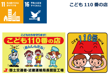 「こども110番の店」は、子供達が安心して暮らせる環境の確保と安全な街づくりの推進を目的として活動しております。当社グループの各店舗では、「こども110番の店」として、子供達がトラブルや犯罪に巻き込まれそうになった時などに緊急避難場所となり、警察への110番通報などを行います。