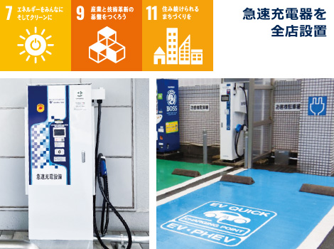 EV・PHEVに必要となる急速充電器を全店に設置し24時間ご利用いただけます。