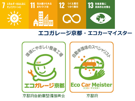 「エコガレージ京都」認定整備工場として、環境保全・環境負荷の低減に取り組むと共に、自動車環境情報のスペシャリスト 「エコカーマイスター」を置き、お客様に自動車環境情報を説明していきます。さらに公害防止など、様々な環境対策に取り組んでいきます。